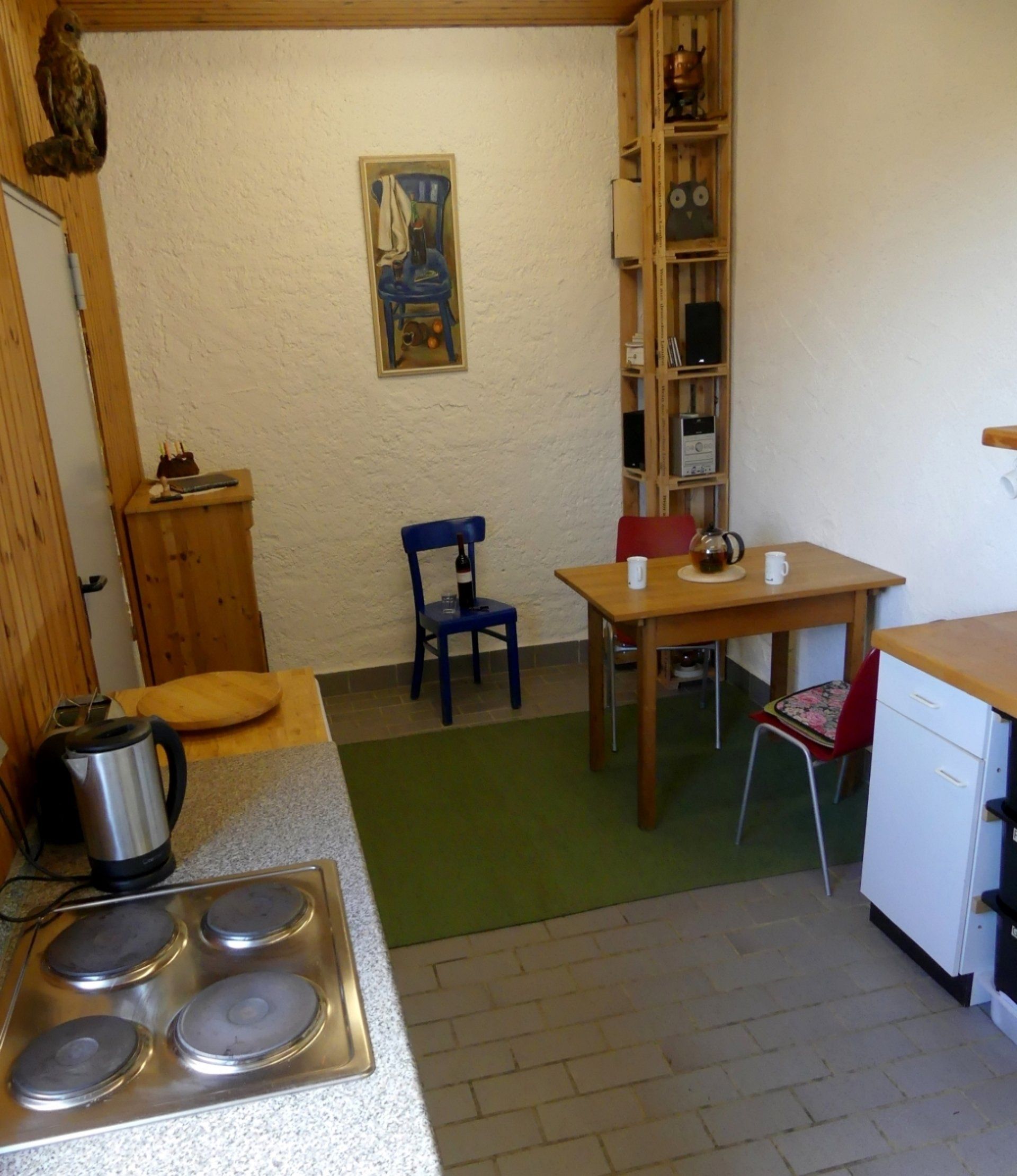 Im Bereich des ehemaligen Pferdestalles befinden sich ein gemütlicher Aufenthaltsraum mit Pelletofen, ein Bad und eine vollausgestattete Küche für die Selbstversorgung. Von der Küche hat man Zugang zur schönen Holzterrasse mit Aussicht ins Grüne.